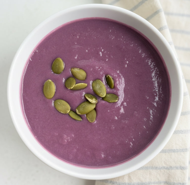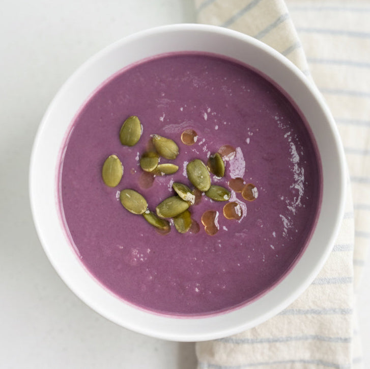 Our Purple Sweet Potato Soup is inspired by Japanese flavors, combining roasted purple sweet potatoes with savory, mineral-rich miso for a beautifully balanced bowl. Purple sweet potatoes are naturally high in anthocyanins - vibrant plant compounds linked to antioxidant and anti-inflammatory support - while miso adds depth, gut-friendly fermentation, and a subtle umami richness. Creamy, grounding, and gently nourishing, this beautiful soup is comfort food with a globally inspired twist. Serving suggestion: raw or gently toasted Pumpkin Seeds