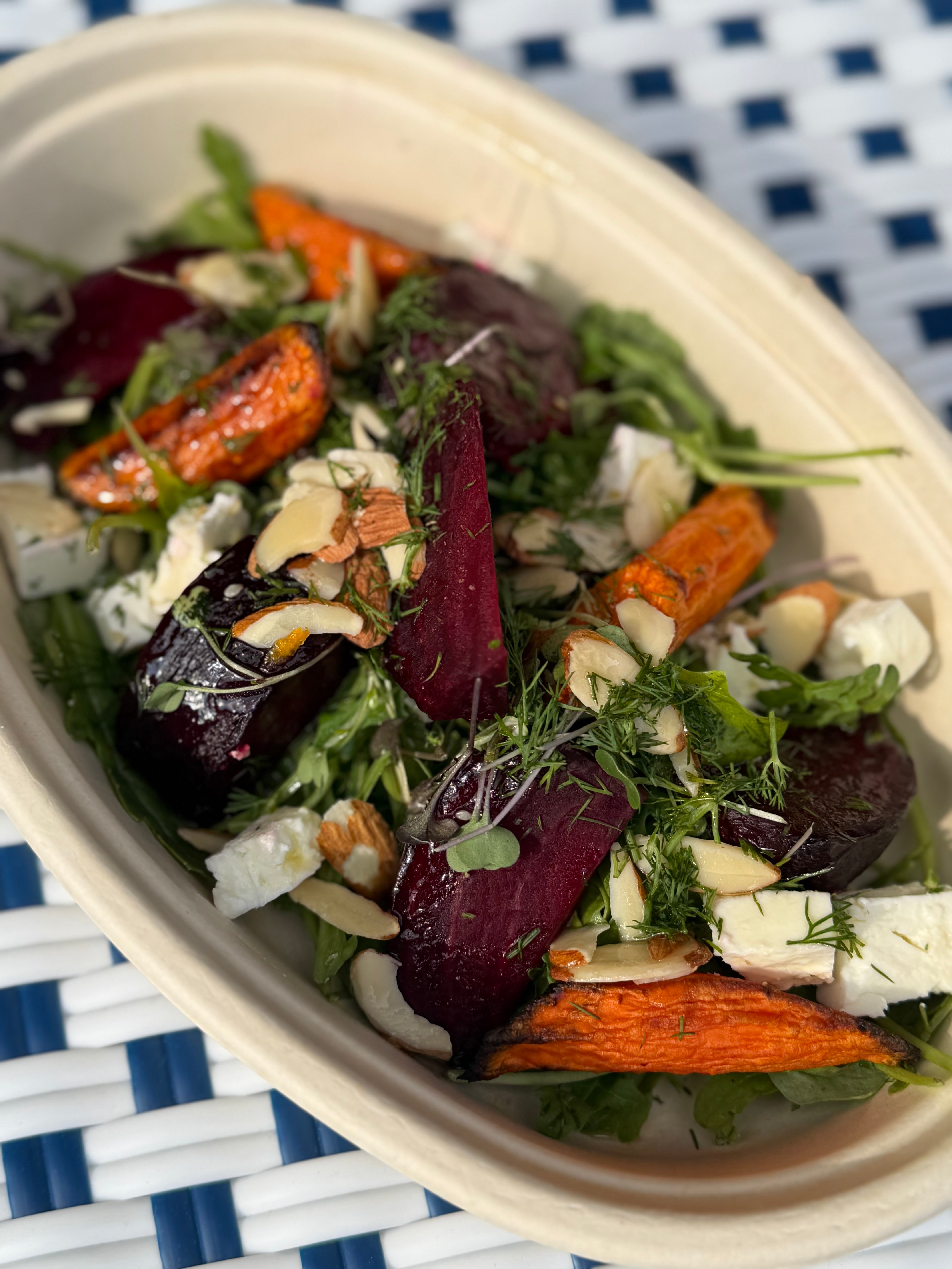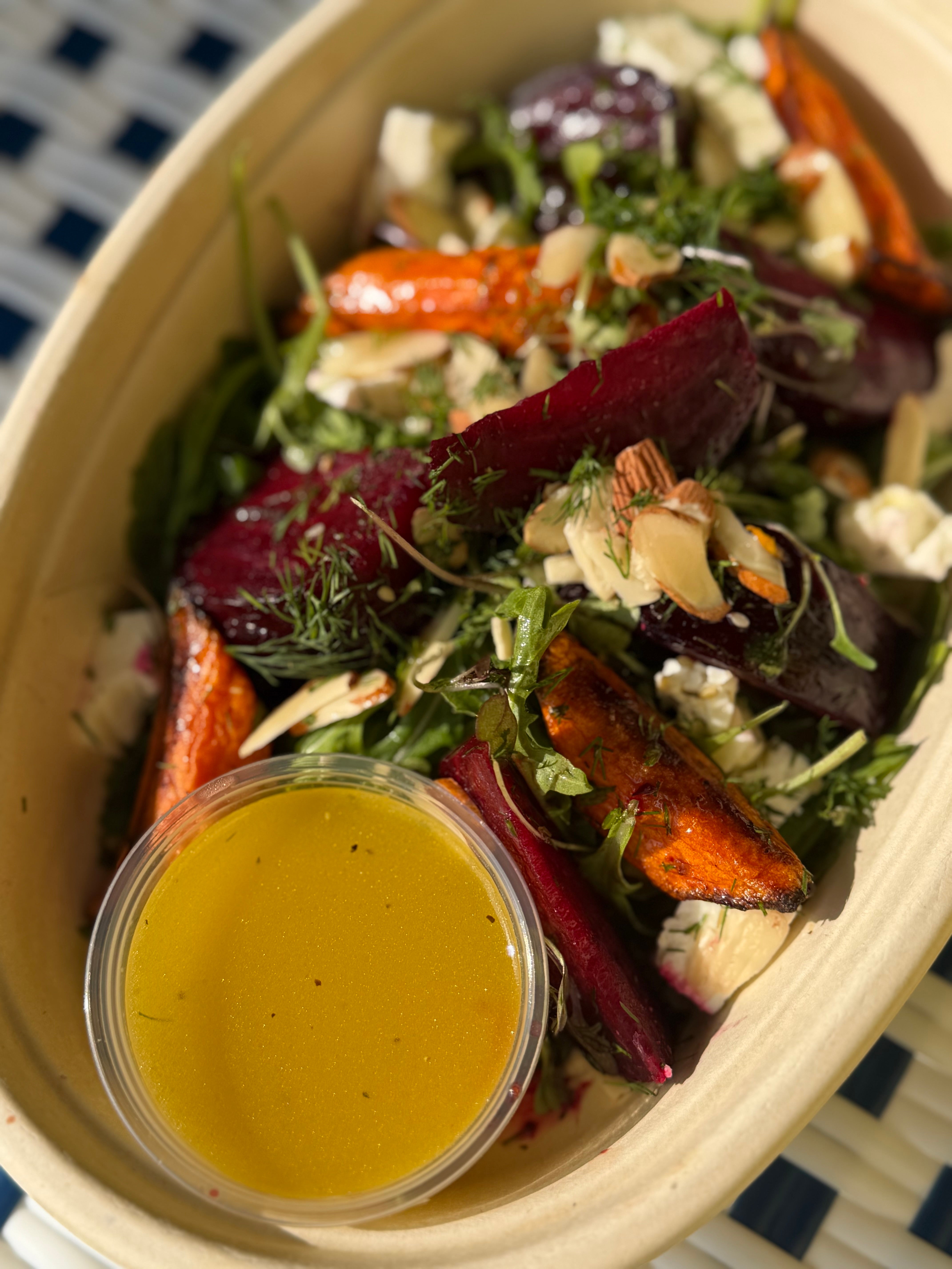 Sweet roasted beets and carrots layered over fresh spinach with fragrant dill, creamy feta, and crunchy almonds. Finished with a bright, orange-infused dressing that brings everything into balance.